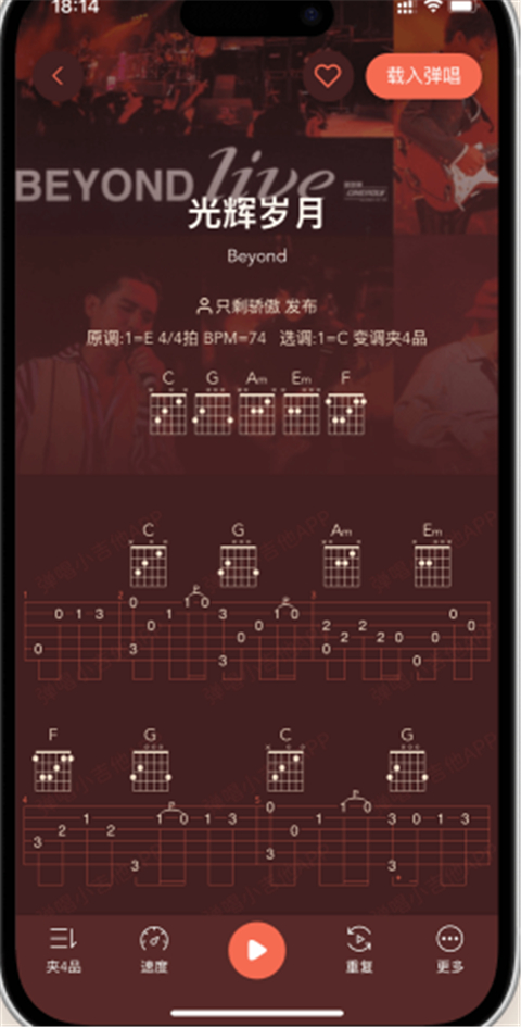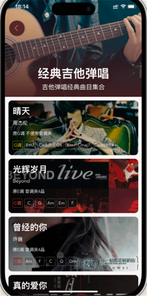 3、智能吉他谱,帮你学习吉他弹唱一首歌,从上手弹奏练习到熟练。