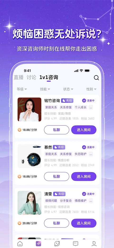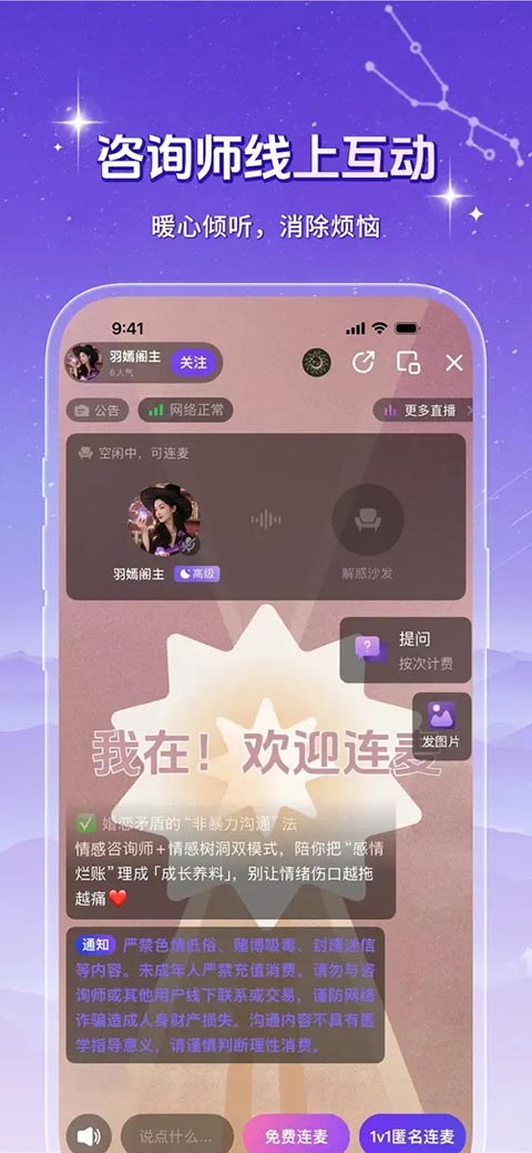 专业心理咨询师精心呈现主题性直播,深入进行案例分析。每日均设免费直播间,您可选择公开连麦或 1V1 匿名连麦,让专业咨询师为您剖析情感问题,给出专业建议。