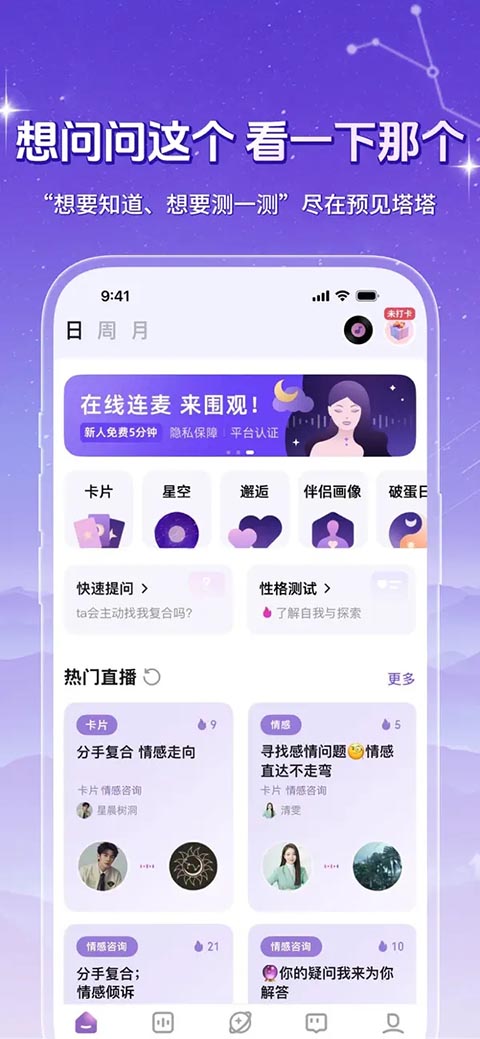 预见塔塔苹果版版是一款将AI与玄学、心理学相结合的泛心理服务平台,为用户提供既有趣又有效的心灵探索。平台入驻100+专业心理咨询师,24小时在线一对一服务,实时分析解答,帮助用户解答心中疑惑。用户每日还可前往免费直播间,公开连麦倾诉,专业咨询师会全面剖析问题,给出专业建议。