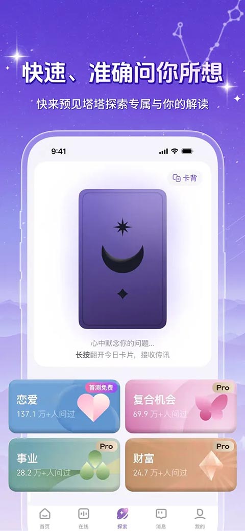 预见塔塔提供四大类牌阵、18个经典牌阵供用户选择,还有塔罗、星座、奇门遁甲、紫薇、八字、六爻等14个东西玄学解答方法,全面解析运势。
