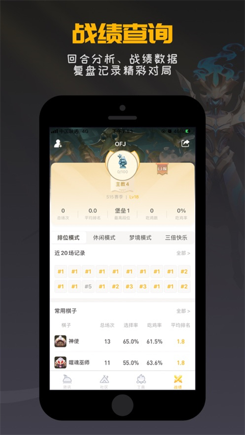 1、战绩:一键查询自己的游戏战绩,总结游戏经验,不断提高技术