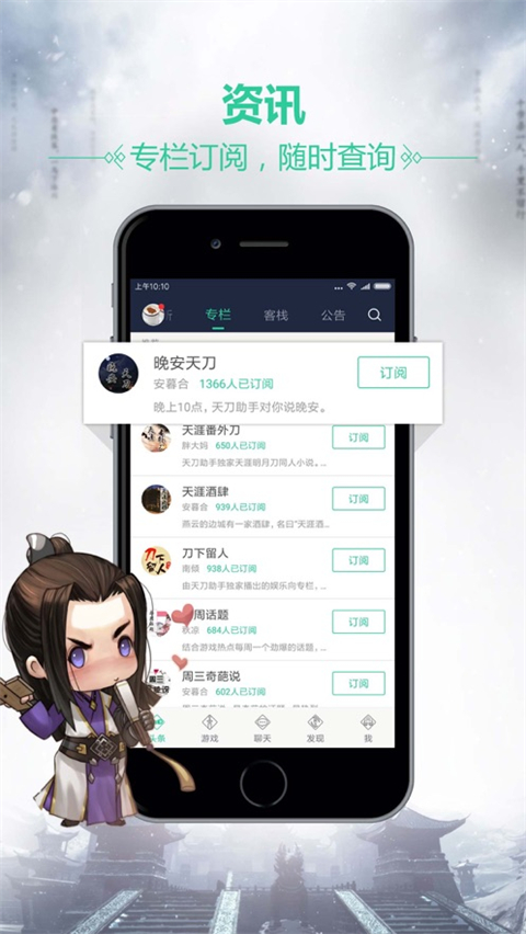 天刀助手苹果版是腾讯官方针对端游《天涯明月刀》推出的一款手机辅助应用,为用户提供游戏好友和帮派等群组织聊天以及好友上线提醒功能,让玩家可以实时与游戏中的好友互动,体验永不离线的游戏乐趣。同时,天刀助手ios版还汇聚了众多热门游戏资讯,维护公告提醒以及游戏攻略视频,帮助玩家快速提高游戏的水平,加深游戏的理解,助你逐渐成为大神玩家。有需要的用户快来下载试试吧!