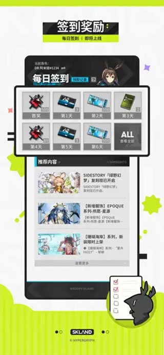 提供每日签到福利,玩家可以通过签到获得合成玉、龙门币等丰富的游戏奖励。