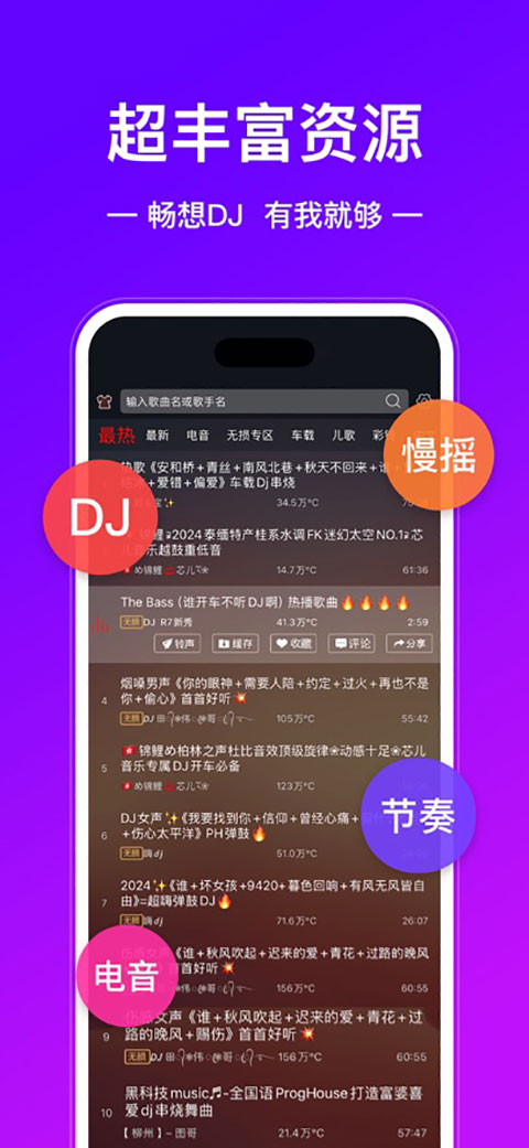 中文DJ舞曲、英文DJ舞曲、3D环绕舞曲,日韩舞曲、车载、夜店、苏荷、喊麦、电音DJ、节奏、Remix、网络DJ、网络红歌,只有想不到,没有找不到。