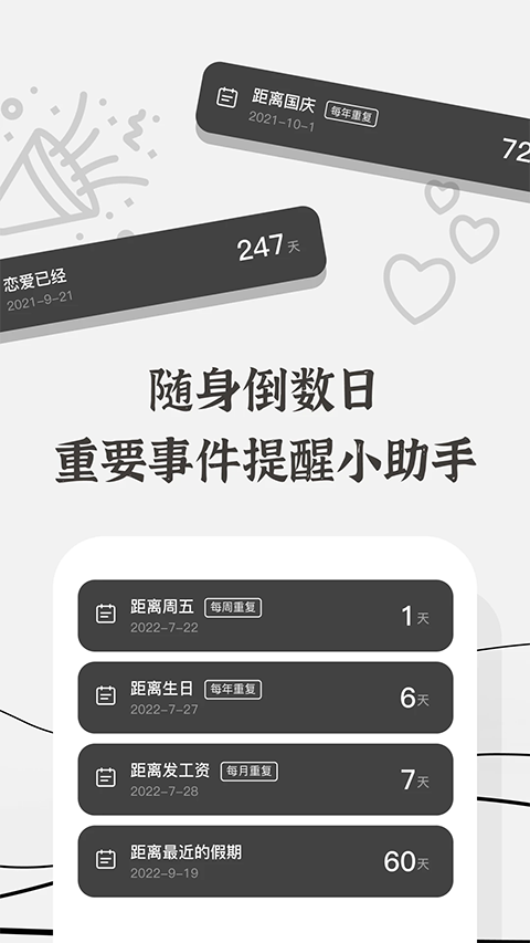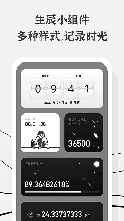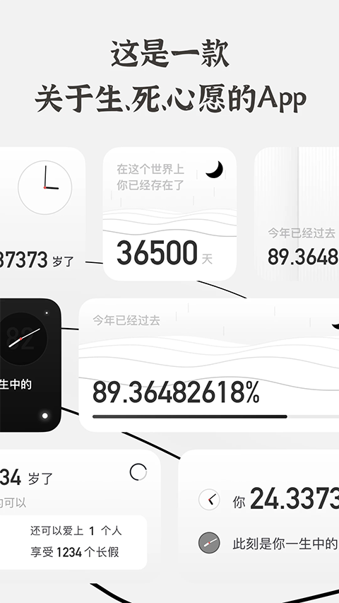 生辰是一款记录你生命终结的始终软件。在这里,你可以随时观看你在世界上还存在多久的时间,只需要你在生辰app中生之钟准确的列出你生时的年、月、周、天、时、分数,也是用来提醒自己,余下的每一天都是在倒计时,努力应该从现下的每一分每一秒开始。每当你打开软件看到这个数字是不是觉得毛骨悚然?是不是想过余下的每一天每一秒还是怎么过,不能再浪费自己的一丝一毫时间,每个人有不同的看法,你可以想成是死亡的倒计时,也可以是努力的每一天。同时对于你这一生剩下的时间可以做多少做了一个粗略的统计计算,这一长串的数字,让你清楚明白,生命中剩下的时间宝贵,帮助你树立正确的人生观。感受时间和生命的流逝,从而珍惜现在和未来。生辰app界面简洁,看起来也是非常舒服的。