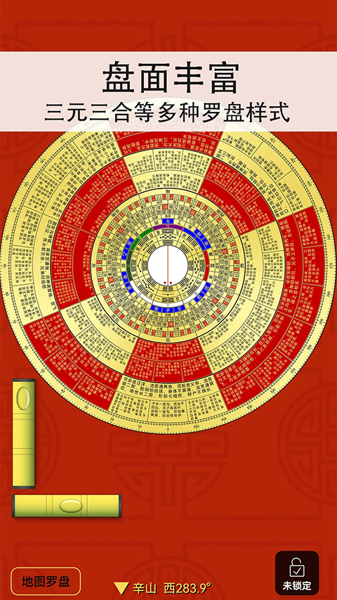 2、应用内有三元盘、三合盘、综合盘、玄空飞星、金锁玉关等多种传统罗盘样式