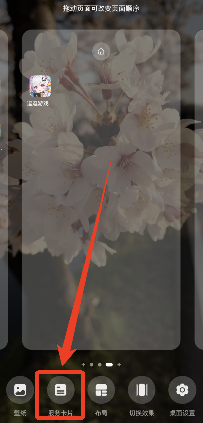 7、如果没有弹出,可根据以下步骤操作,不同品牌的手机添加小组件的方式不同,这里拿华为举例。后台退出软件,返回到桌面,双指缩放捏合,点击下方的【服务卡片】。