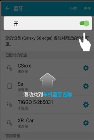 3、在手机设置里找到蓝牙选项,勾选开启,对照车机蓝牙名称,扫描找到车机蓝牙,然后点击进行配对。