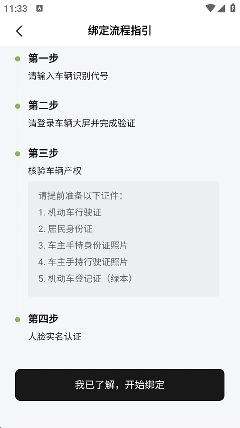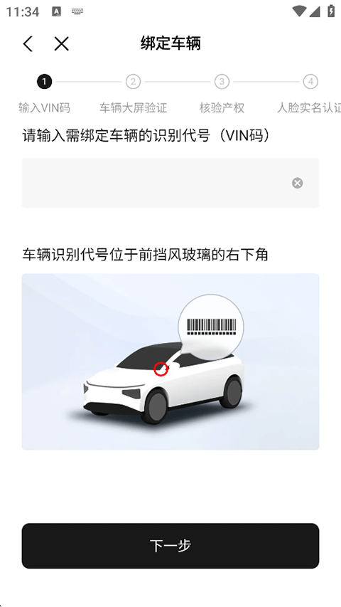 3、输入需绑定车辆的识别代号(VIN码)后点击下一步,继续车辆大屏验证、核验产权以及人脸实名。