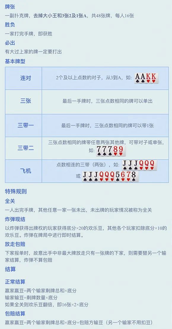 使用48张扑克牌(去掉了大小王、3张2、1张A),开局分别给每人发16张牌。